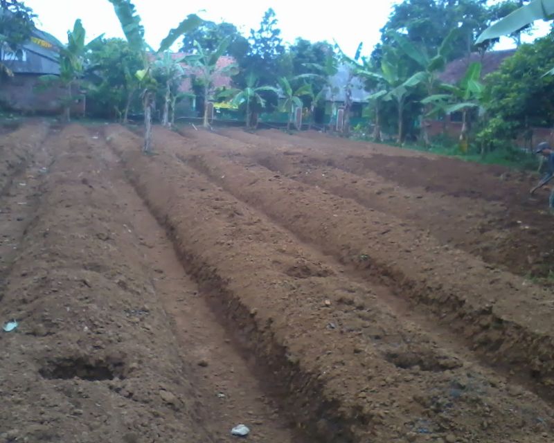 Kedua hamparan tanaman kemudian di miringkan ke arah tengah. Nah, pada titik tengah pertemuan kedua bedengan di buat saluran air selebar 20 cm dan dengan kedalaman 10 cm.