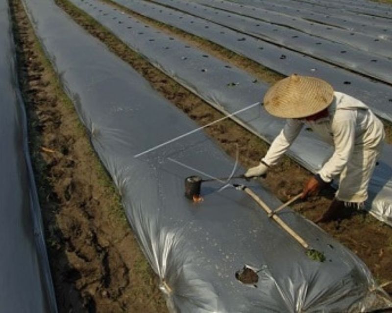 Siapkan mulsa plastik yang sudah di lubangi dengan diameter 10 cm dengan jarak yang sama antar lubangnya. Gunakan mulsa plastik ini menutupi bedengan yang sebelumnya telah di buat. Ujung mulsa di tahan dengan bilah bambu atau kawat.