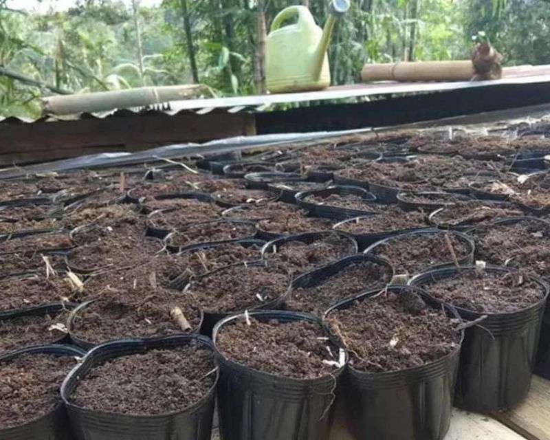 - Alat tanam kulit kayu, kompos, pupuk kandang dan tanah dengan perbandingan 2:1:1:2 lalu campur semuanya