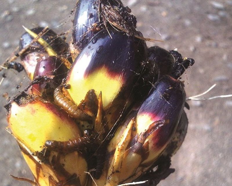 - Sanitasi lingkungan dengan membuang dan memusnahkan buah-buahan busuk yang terserang penggerek tandan.